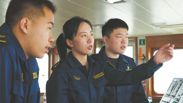 Zhan Chunpei (center) is captain of the Haixun 01, a 5,000-ton patrol vessel belonging to the Shanghai Maritime Safety Administration. CHINA DAILY
